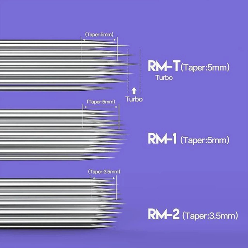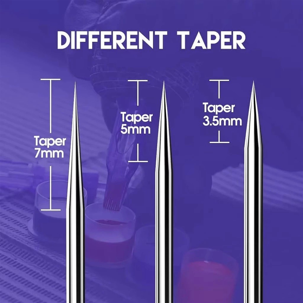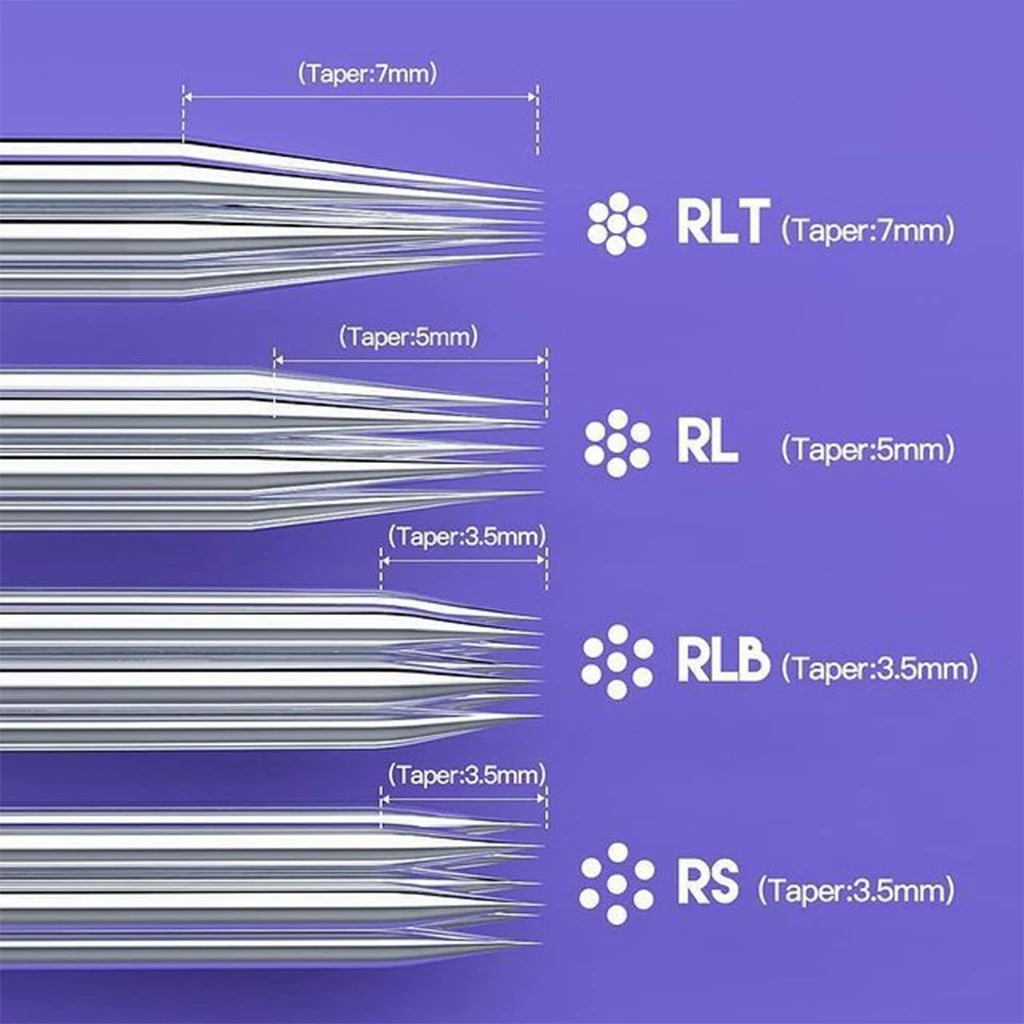 🔗RL割線針(縮口圓針):針尖集中成一個點,可以做出細緻扎實的線條,通常刺青割線都是用它來完成的。